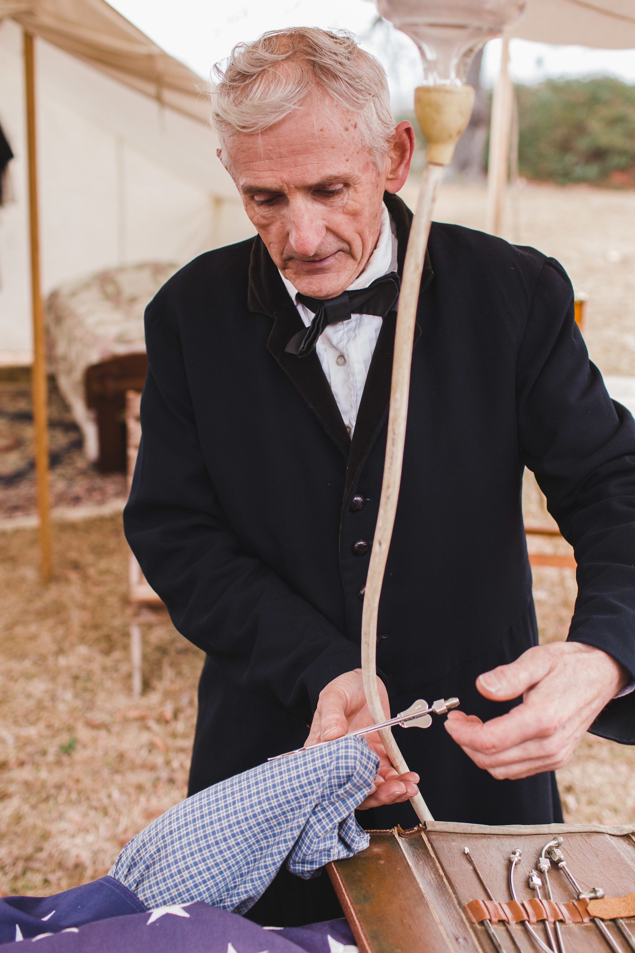 Embalming became a standard practice during the Civil War, and the mechanics of the trade have barely changed since. Aitkin says, “We do it as correctly as possible. We can back up everything we say and do from written documentation from at least two different sources.” Aitkin’s son encouraged him to reenact.